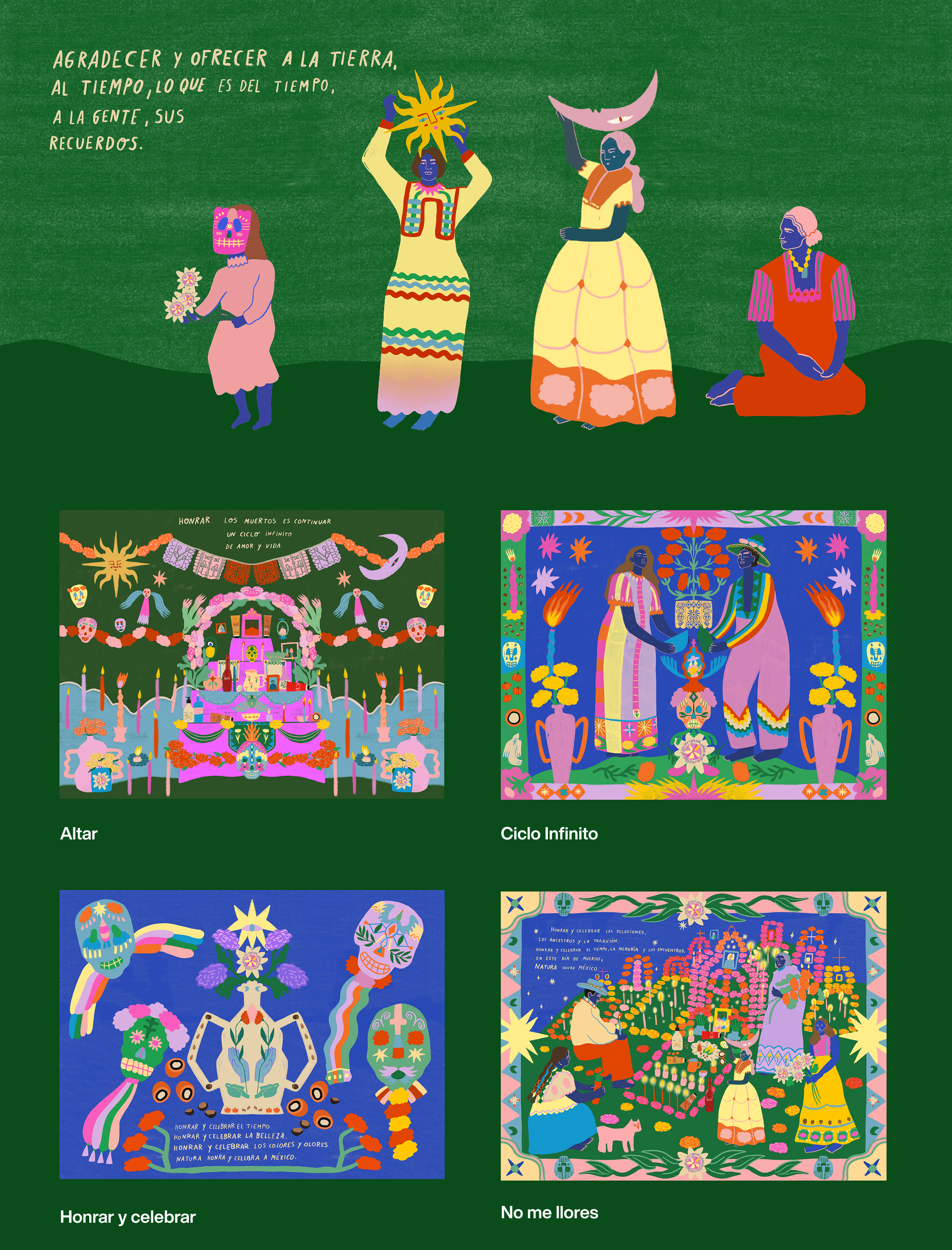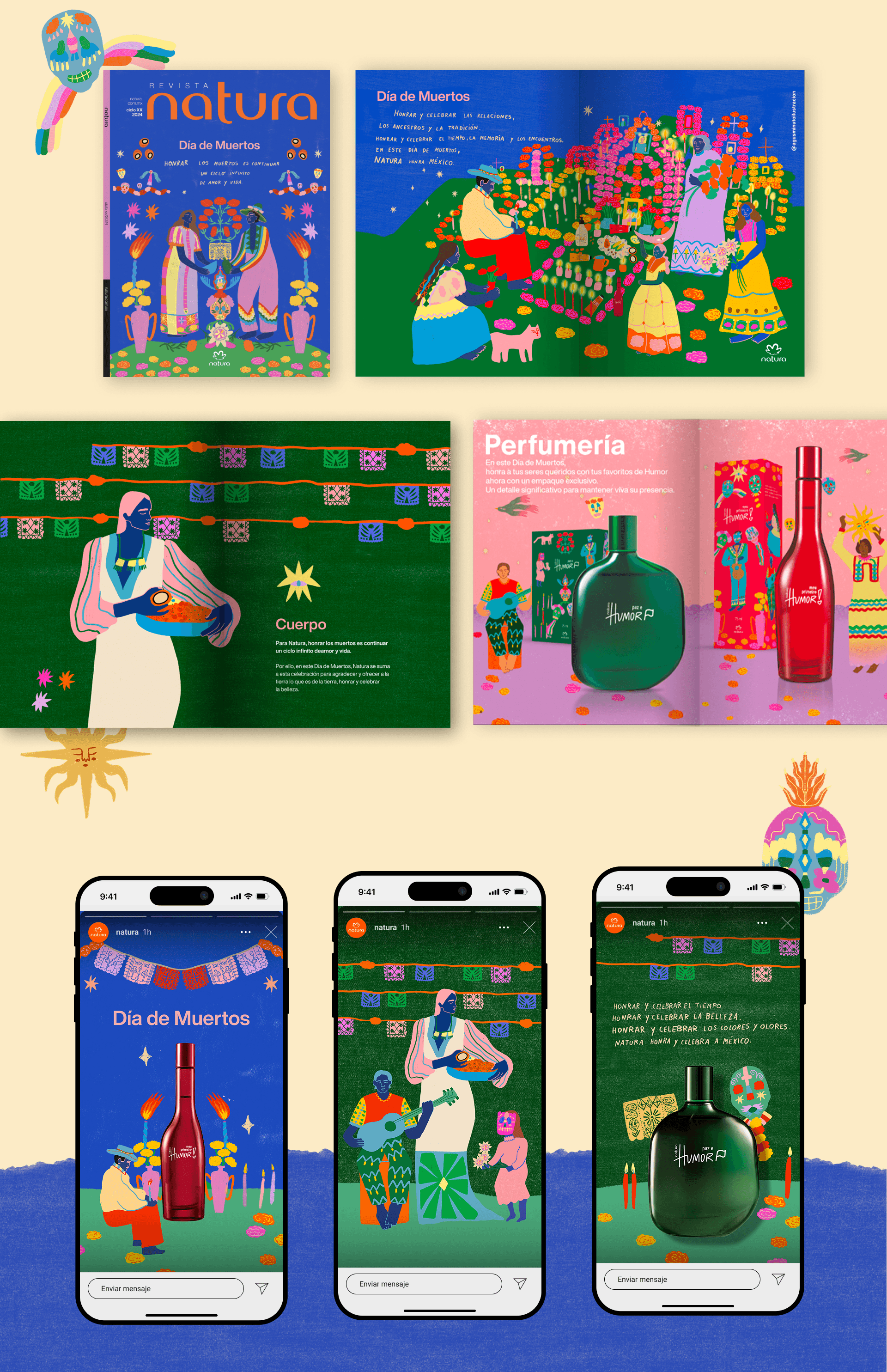 El proyecto incluyó el manifiesto narrativo, key visual y aplicaciones gráficas para revista, redes y materiales editoriales. Las ilustraciones de Agus Minuto dieron vida a un universo visual vibrante y lleno de significado, inspirado en altares, flores, calaveras y la energía del cempasúchil.
