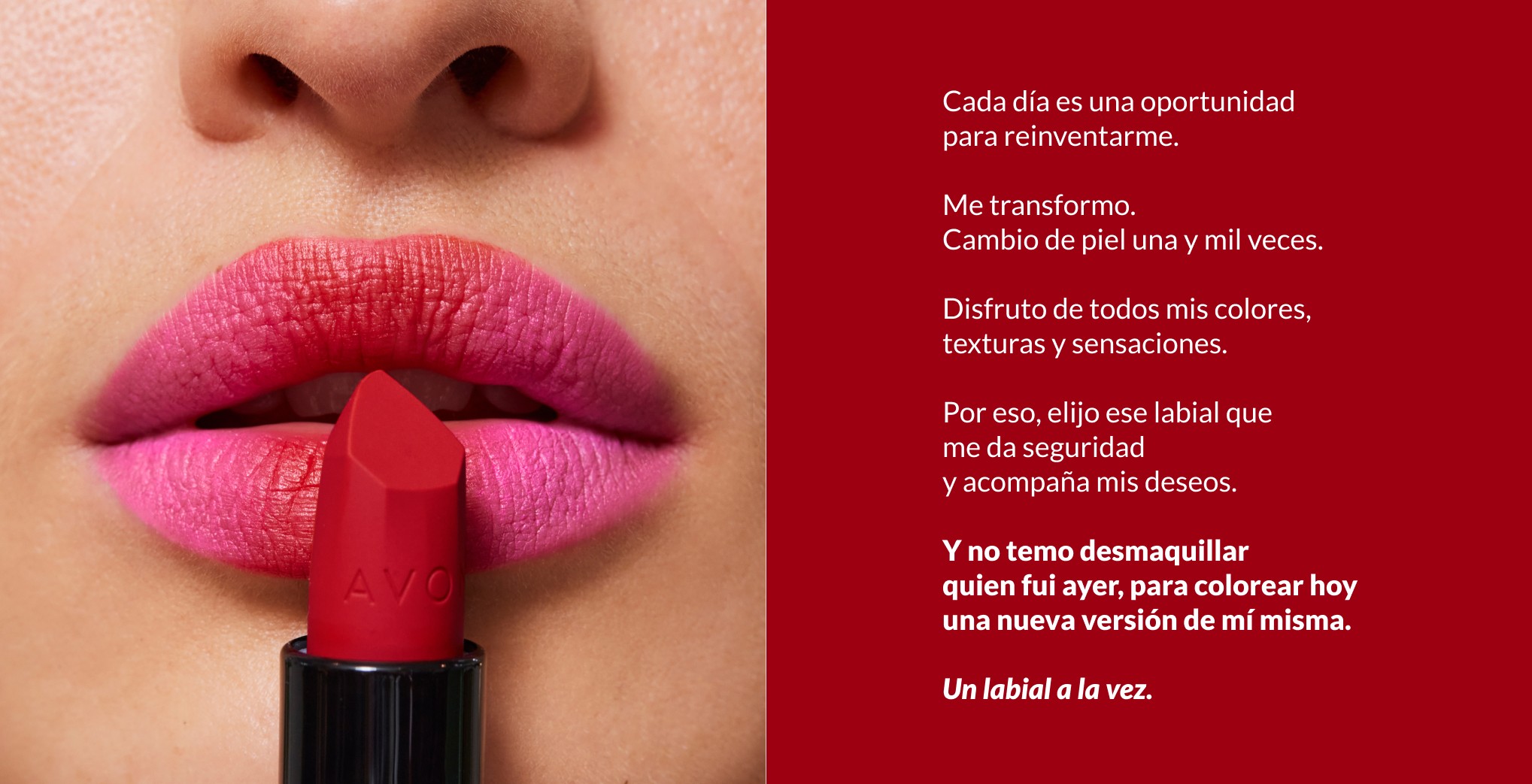 Para celebrar el Día del Labial, desarrollamos una campaña integral para AVON con foco en el empoderamiento, la autoexpresión y la transformación diaria de las mujeres a través del maquillaje. Partiendo del insight “cada día es una oportunidad para ser una nueva versión de nosotras mismas”, construimos una narrativa emocional que posiciona al labial como una herramienta poderosa de identidad y confianza.